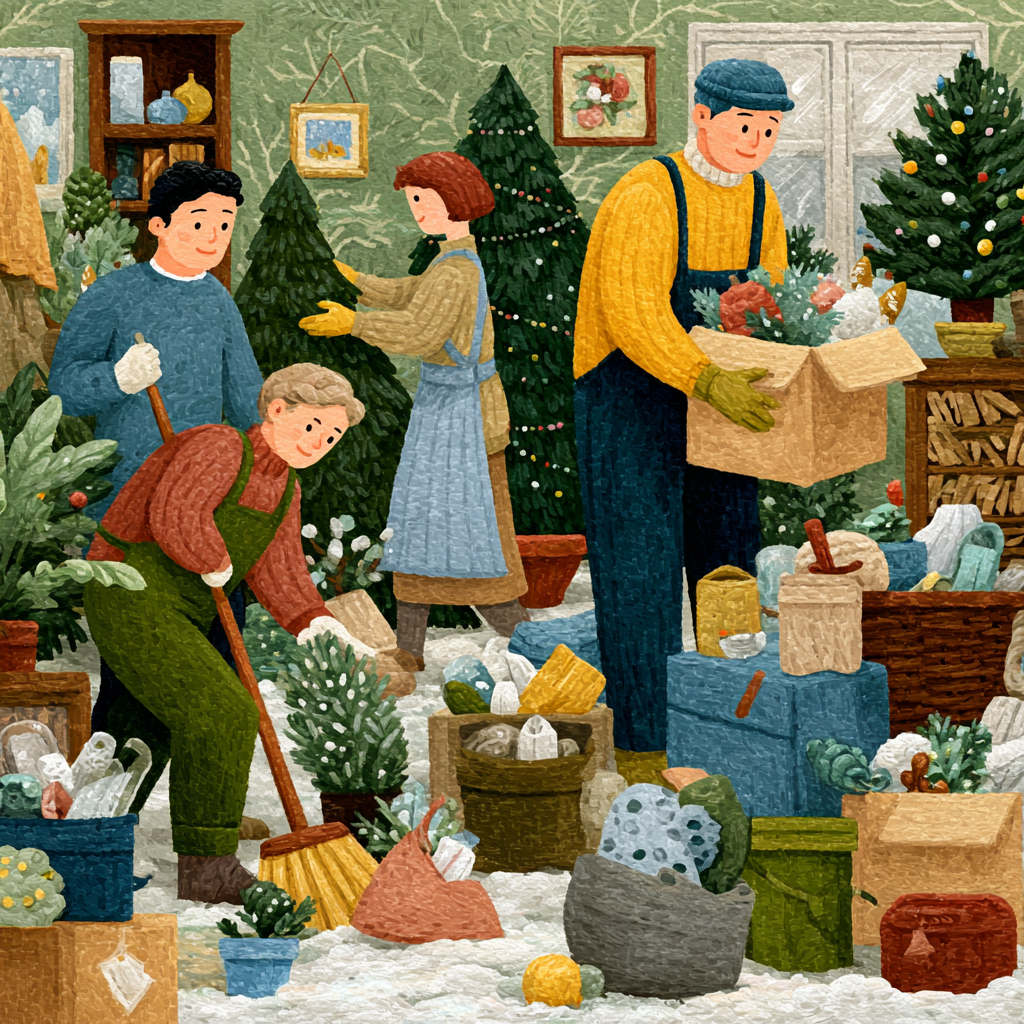 Ель — символ праздника, но когда огоньки погасают, приходит время убрать её до следующего года. Если у вас настоящая ёлка, снимите игрушки, аккуратно сложите гирлянды в коробку и отнесите дерево на улицу. Живые иголочки оставляют следы — пройдитесь по ковру щёткой или используйте пылесос. Стеклянные игрушки заверните в бумагу, чтобы избежать повреждений, и подпишите коробки: «гирлянды», «игрушки для верхушки», «деревянные украшения». В следующий раз вы сэкономите массу времени.